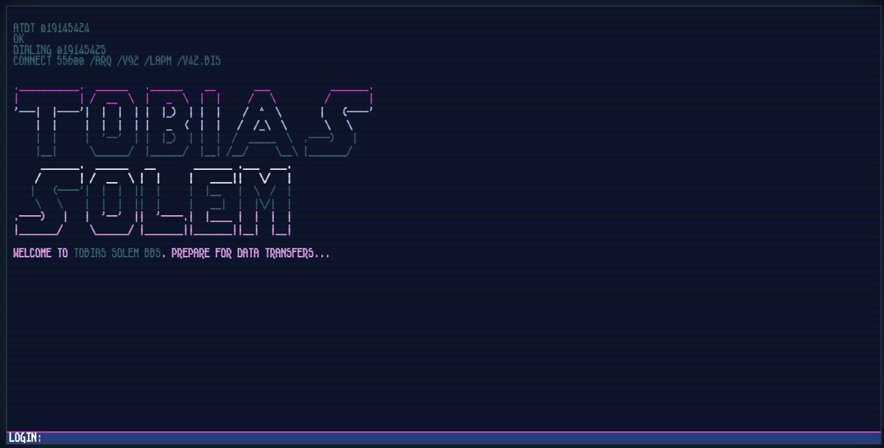 The Tobias Solem BBS is an ARG where you are helping to put together fragments of a shattered AI's identity together with other participants. There are multiple obstacles in your way, including a hot-headed, angry AI called Summerspoken that tries to make things difficult for you and those you're working together with.